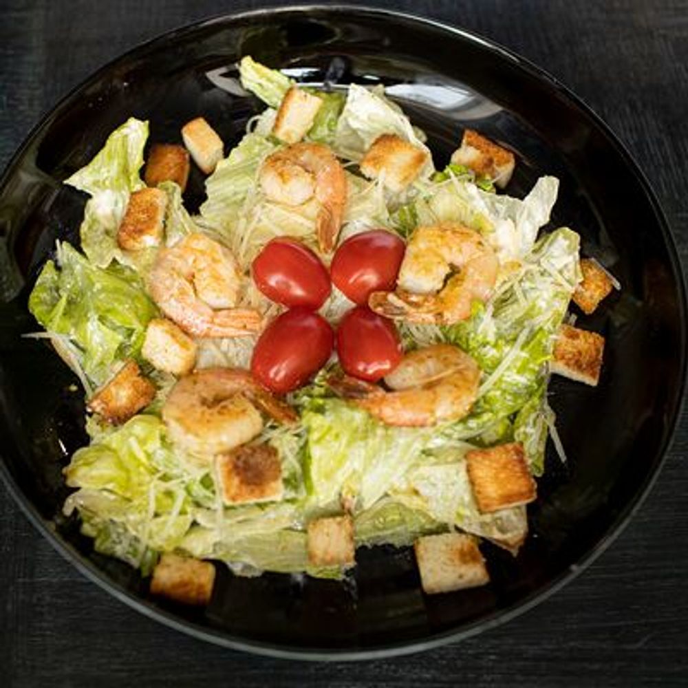 Креветки, соус соевый, салат айсберг, соус цезарь, помидоры черри, сыр пармезан, сухарики пшеничные