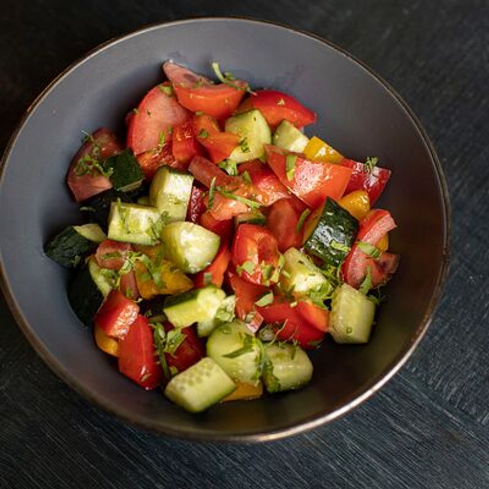 Огурцы свежие, помидор свежий, перец болгарский, масло подсолнечное, зелень, соль
