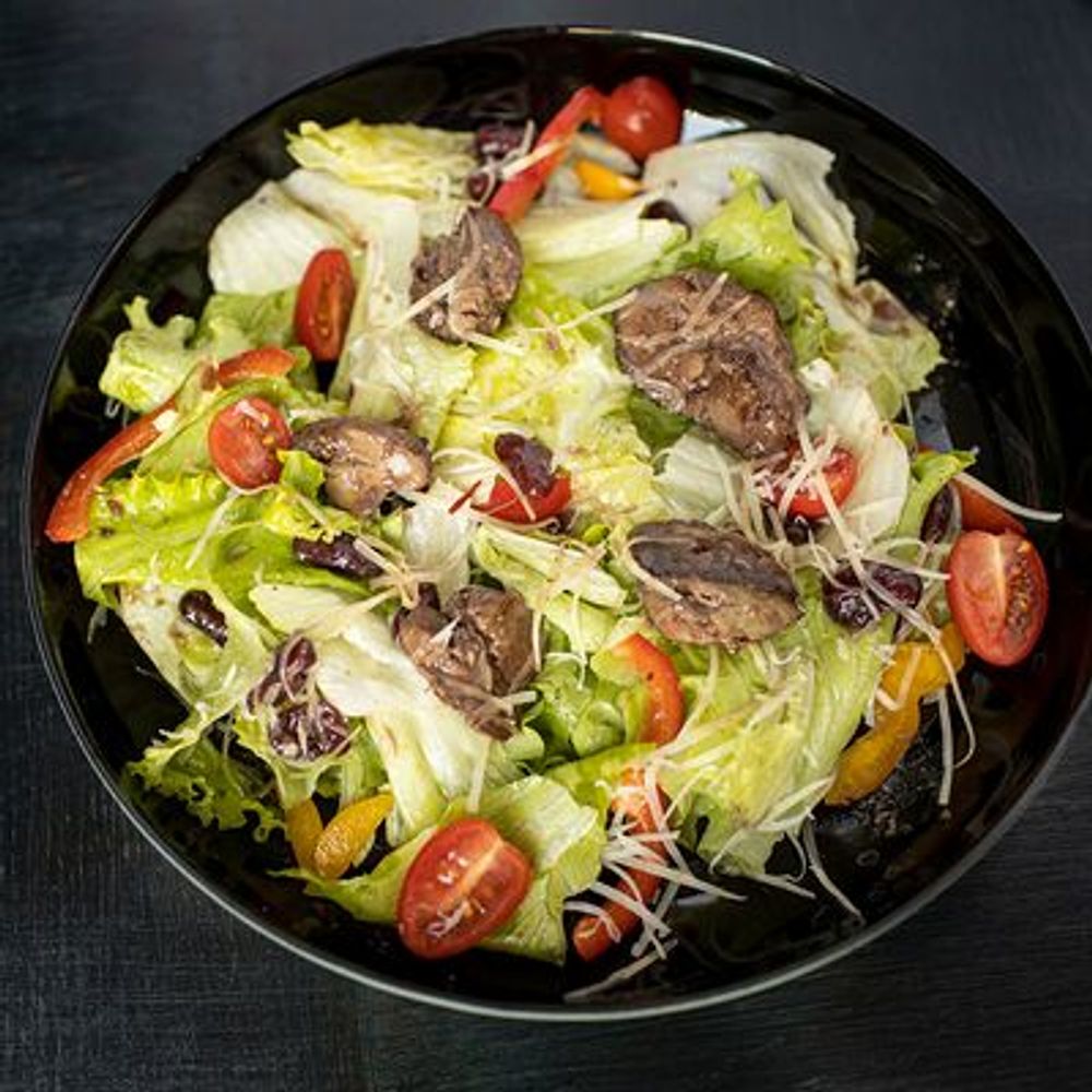 Печень куриная, салат айсберг, салат листовой, помидор черри, перец болгарский, фасоль консервированная, соус клюква, масло оливковое, сыр пармезан, соль, перец черный молотый