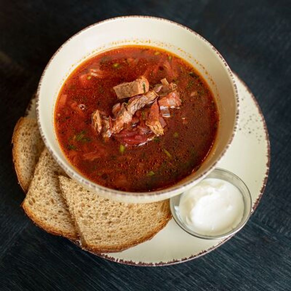 Говядина (грудинка), свекла, капуста, картофель, сметана, чеснок, морковь, лук репчатый
