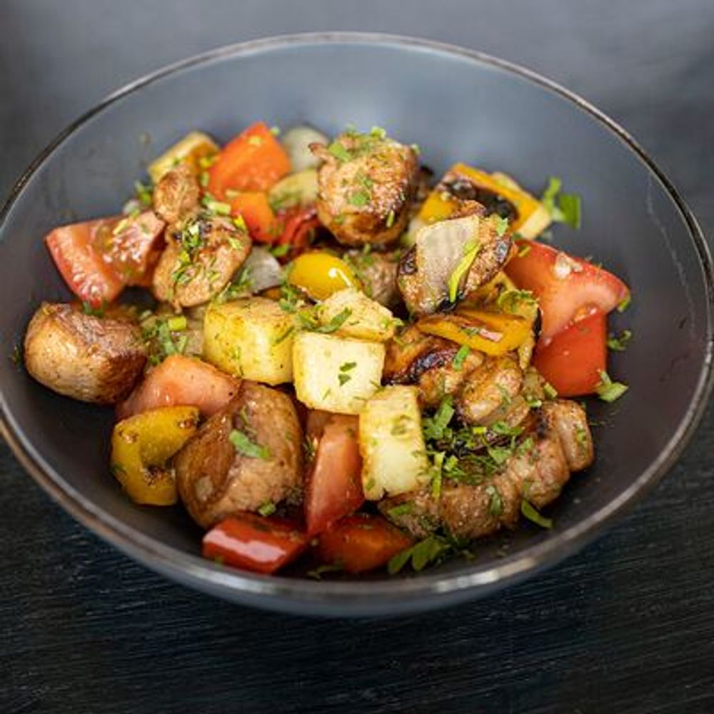 Свинина, картофель, помидор, лук репчатый, перец болгарский, зелень