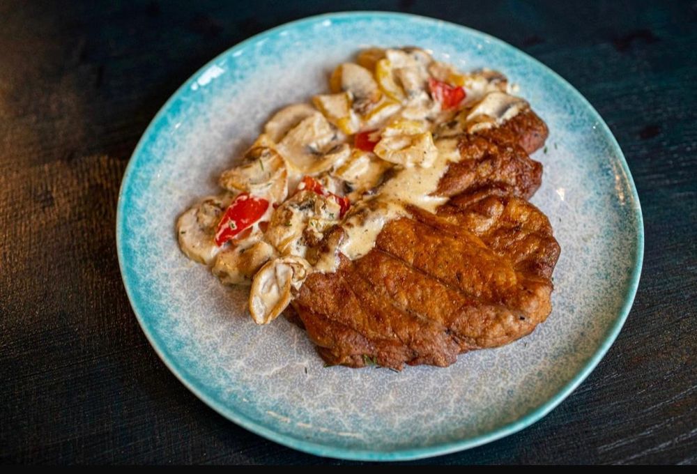 Свинина, грибы, перец болгарский, сливочный соус, специи