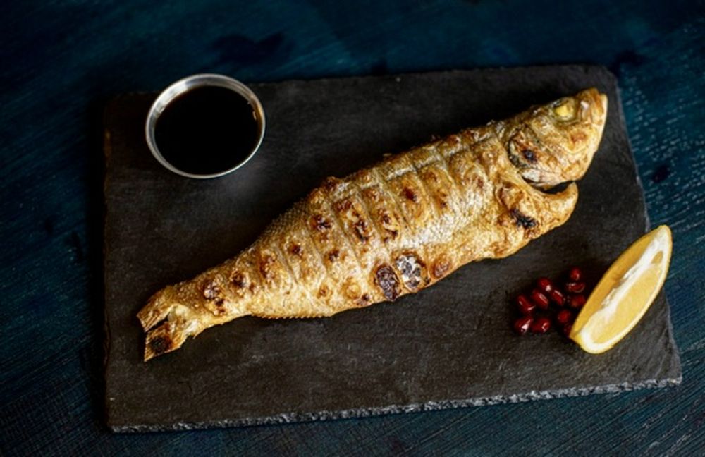Сибас 1 шт, соус наршараб, специи, лимон
