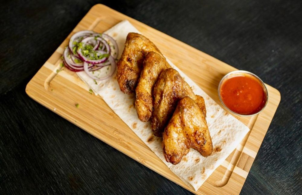 Куриные крылышки,соус шашлычный,лаваш,лук красный