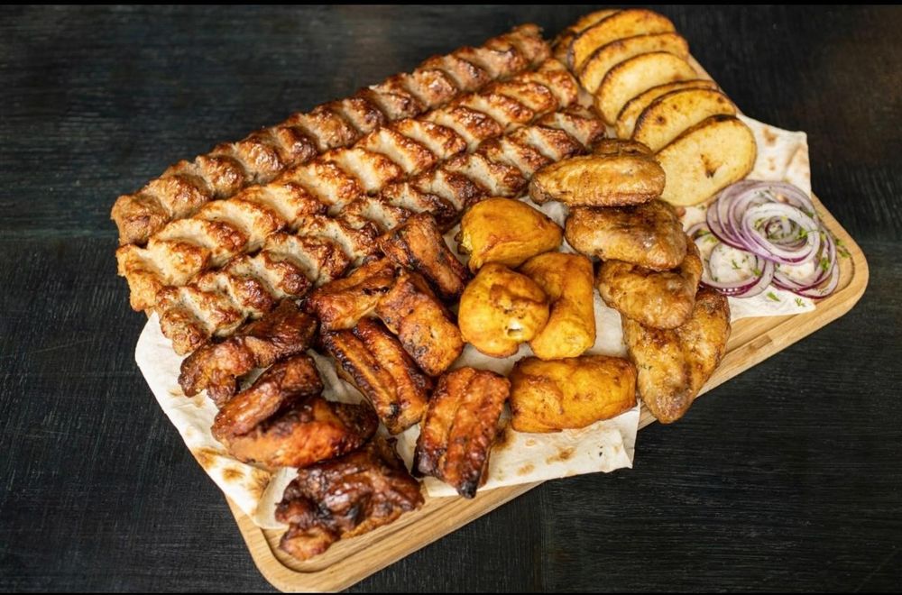 Люля-кебаб из говядины,Люля-кебаб из баранины,Люля-кебаб из свинины,Люля-кебаб из курицы,Куриные крылышки,Куриная грудка,Ребра свиные,Шея свиная,Картофель,Шампиньоны,Соус Шашлычный,Лук красный, Лаваш. На 8 персон