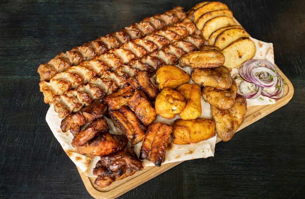 Люля-кебаб из говядины, люля-кебаб из курицы, люля-кебаб из свинины, куриные крылышки, куриная грудка, ребра свиные, шея свиная, картофель, соус шашлычный, лук красный, лаваш. На 6 персон